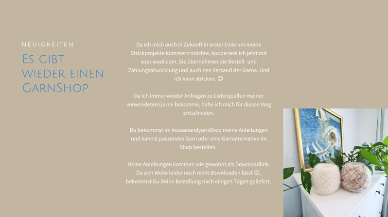 Corona kam und blieb länger als gedacht. Und auch bei oceanandyarn hat es Veränderungen gegeben. In der Zwischenzeit betreibe ich meinen WollShop in Kooperation mit soul-wool.com. So habe ich mehr kostbare Strickzeit für neue Tücher, Cardigans & Pullover.