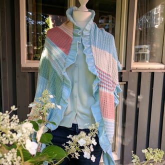 Das ganze asymmetrische Tuch besteht aus vier verschiedenen Farben und linken und rechten Maschen.